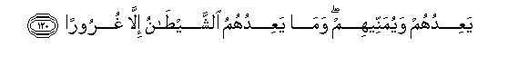 [116-122] Shirk144 is the only sin that Allah does. not forgive. He may forgive whomever He will, other than this sin, for whoever associates partners with Allah does, in fact, go far astray into deviation. The mushriks invoke to goddesses instead of Allah: they invoke that rebellious Satan,145 on whom Allah has laid His curse; (they obey that Satan) who said to Allah, "I will most surely take due share from your servants146 and will mislead them; I will entice them by vain desires; I will command them and they will slit147 the ears of the cattle by my order, and I will command them and they will make alterations and corrupt Allah's creation."148 Therefore whoever makes this same Satan his patron, instead of God, becomes a manifest loser. Though he makes (false) promises with people and entices them by vain hopes149 all his promises are nothing but deception. The abode of such people is Hell from where they will find no way of escape. As regards those, who believe and do good deeds, We will admit them into Gardens underneath which canals flow, wherein they will abide for ever. This promise of Allah is true and who can be truer in his word than Allah?