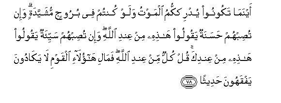 [77-78] Have you also marked those to whom it was said, "Withhold your hands (a while from war) and establish the Salat and pay the Zakat.? Now that they have been commanded to fight, some of them fear the people as they should fear Allah, or even more than that;107 they say, `Our Lord, why have You prescribed fighting for us? Why have You not given us further respite?" Say to them, "The pleasures of this worldly life are trifling and the life of the Hereafter is much better for a man who fears Allah, and you shall not be wronged in the least.108 As to death, it will overtake you wherever you may be, even though you be in fortified towers" If they have good fortune, they say, "This is from Allah," and if they suffer a loss, they say, "This is because of you."109 Say, "Everything is from Allah." What then has gone wrong with these people that they do not understand anything? Whatever good comes to you, O man, it is by Allah's grace, and whatever evil befalls you, it is the result of your own doings.