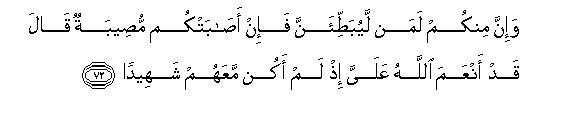 [71-72] Believers, be always prepared for encounter,101 and advance in detachments or march in a body, as the occasion may require. Well, there are among you such as shirk fight;'102 if a disaster befalls you, they say, "Allah has been very gracious to us that we did not accompany these people."