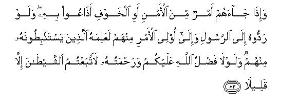 [83] Whenever these people hear any news concerning peace or danger, they make it known to all and sundry; instead of this, if they should convey it to the Messenger and to the responsible people of the Community, it would come to the knowledge of such people who among them are capable of sifting it and drawing right conclusions from it.112 (Your weaknesses were such that) had it not been for Allah's grace and mercy towards you, all of you except a few, would have followed Satan.