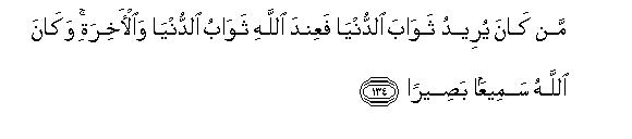 [132-134] Yes, Allah is the Owner of all that is in the heavens and the earth, and He suffices for help and protection. If He will, He may put you away, O people, and replace you by others and He is All Powerful to do this. Whoso desires the reward of this world should know that Allah possesses the rewards of both this world and the Hereafter: He hears everything and sees everything.163