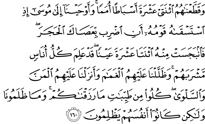 Translation: And We had divided them into twelve clams and made them distinct Communities. When his people asked him tar water. We inspired Moses to strike a certain rack with his staff. Consequently, twelve springs gushed forth from it and each community specified its drinking place: We caused the cloud to cast shadow over them, and We sent down manna and salva for their food. saying. "Eat of the clean and pure things We have provided for you." However, by doing what they did afterwards, they did no wrong to Us but they wronged themselves.