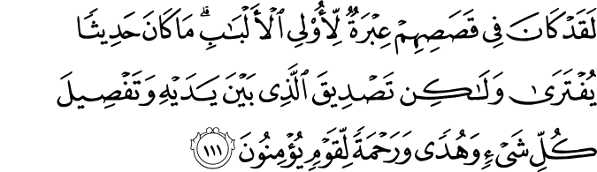 photoTransliteration: Laqad kana fee qasasihim AAibratun liolee alalbabi ma kana hadeethan yuftara walakin tasdeeqa allathee bayna yadayhi watafseela kulli shayin wahudan warahmatan liqawmin yuminoona
