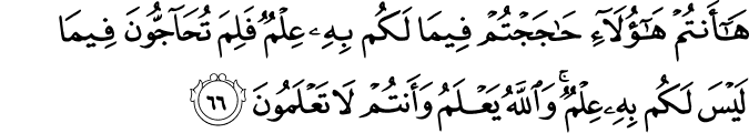 photoTransliteration: Haantum haolai hajajtum feema lakum bihi AAilmun falima tuhajjoona feema laysa lakum bihi AAilmun waAllahu yaAAlamu waantum la taAAlamoona