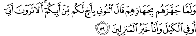 Translation: When he had them given the provisions due to them and they were leaving, he said, "Bring your step brother to me. Do you not see that I give full measure and am the best of hosts?