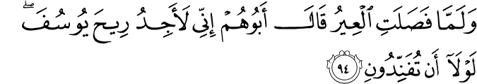 photoTransliteration: Walamma fasalati alAAeeru qala aboohum innee laajidu reeha yoosufa lawla an tufannidooni