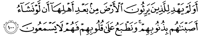 photoTransliteration: Awalam yahdi lillatheena yarithoona alarda min baAAdi ahliha an law nashao asabnahum bithunoobihim wanatbaAAu AAala quloobihim fahum la yasmaAAoona