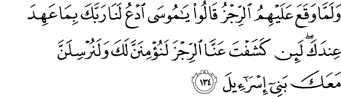 Translation: Whenever a plague befell them, they would say, "O Moses! Pray for us to Allah in the name of the office you hold from Him. If you help remove the plague from us this time, we will believe in you, and send the Israelites with you."