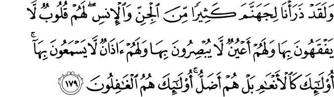 photoTransliteration: Walaqad tharana lijahannama katheeran mina aljinni waalinsi lahum quloobun la yafqahoona biha walahum aAAyunun la yubsiroona biha walahum athanun la yasmaAAoona biha olaika kaalanAAami bal hum adallu olaika humu alghafiloona
