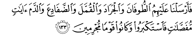 Translation: At last We let loose upon them the storm, the locusts, the lice, and the frogs, and rained blood upon them. Though We showed these Signs, one by one, they persisted in their rebellion; for they were steeped in crime.