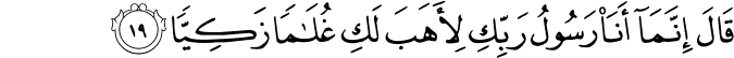 Translation: He replied, "I am a mere messenger from your Lord and have been sent to give you a pure son."