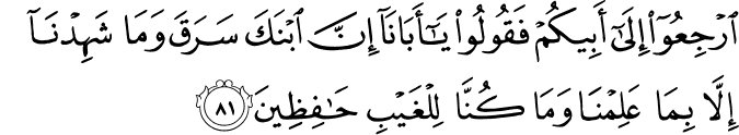 Translation: Go back to your father and say, `Dear father, your son committed a theft. We did not see him stealing: we are simply stating what we have come to Know and we could not guard against the unforeseen.