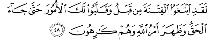 Translation: Even before this, these people had striven to stir up mischief and turn by turn they practiced all sorts of devices to make you unsuccessful, until the Truth prevailed and Allahs design was fulfilled, though they were averse to it.