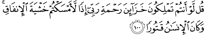 Translation: O Muhammad, say to them, "Had the treasures of your Lords blessings been in your possession, you would have held them back lest they should be spent up. Indeed man is very narrow minded."