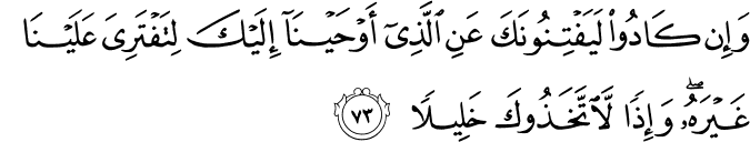 Translation: O Muhammad these people have left no stone unturned to tempt you away from that which We have revealed to you so that you might fabricate something in Our name. Had you done that, they would have made you their friend.