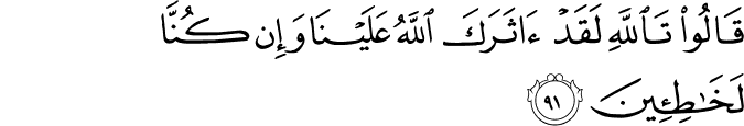 photoTransliteration: Qaloo taAllahi laqad atharaka Allahu AAalayna wain kunna lakhatieena