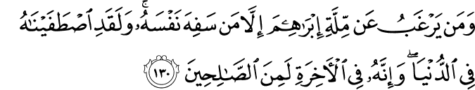 photoTransliteration: Waman yarghabu AAan millati ibraheema illa man safiha nafsahu walaqadi istafaynahu fee alddunya wainnahu fee alakhirati lamina alssaliheena