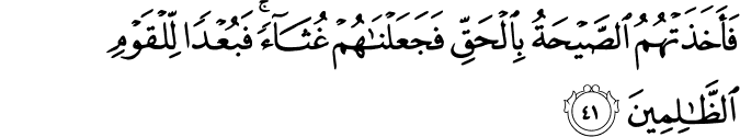 photoTransliteration: Faakhathathumu alssayhatu bialhaqqi fajaAAalnahum ghuthaan fabuAAdan lilqawmi alththalimeena