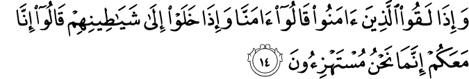 photoTransliteration: Waitha laqoo allatheena amanoo qaloo amanna waitha khalaw ila shayateenihim qaloo inna maAAakum innama nahnu mustahzioona