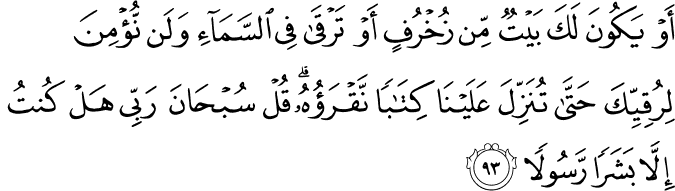 Translation: or a house of gold comes into being for you or you ascend the sky, and we are not going to believe in your ascension until you bring down to us a writing that we may read"O Muhammad, Say to them, "My Lord be glorified! have I ever claimed to be anything more than a human Messenger?"