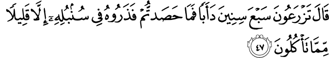 photoTransliteration: Qala tazraAAoona sabAAa sineena daaban fama hasadtum fatharoohu fee sunbulihi illa qaleelan mimma takuloona