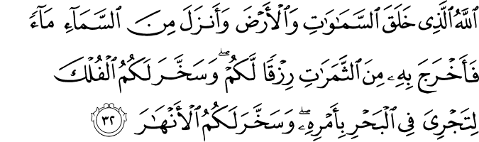 Translation: Allah is He Who has created the heavens and the earth, and He sent down rain water from the sky where with He produced different kinds of fruits to provide you with food. It is He Who subdued the ship for you that it may sail in the seas by His order and likewise He subdued the rivers for you.