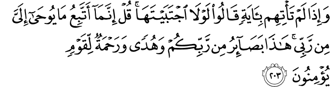 photoTransliteration: Waitha lam tatihim biayatin qaloo lawla ijtabaytaha qul innama attabiAAu ma yooha ilayya min rabbee hatha basairu min rabbikum wahudan warahmatun liqawmin yuminoona
