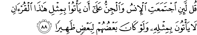 Translation: Declare this, "Even if human beings and jinns should cooperate with one another to bring forth a book like the Qur'an, they will never be able to bring anything like it, even though all of them help one another."