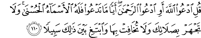 Translation: O Prophet, say to them, “You may call Him by any name, Allah or Rahman, for it is all the same by whichever name you call Him because all His names are most excellent. And do not raise your voice high in your Prayer nor make it very low but adopt the middle way between these two