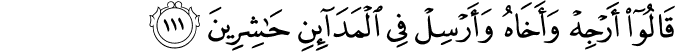 photoTransliteration: Qaloo arjih waakhahu waarsil fee almadaini hashireena
