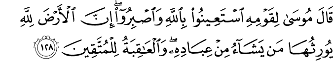 photoTransliteration: Qala moosa liqawmihi istaAAeenoo biAllahi waisbiroo inna alarda lillahi yoorithuha man yashao min AAibadihi waalAAaqibatu lilmuttaqeena