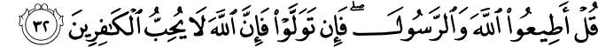 Translation: Also say to them, "Obey Allah and His Messenger." And if, in spite of this, they do not accept your invitation, (warn them that) Allah does not love those who refuse to obey Him and His Messenger.