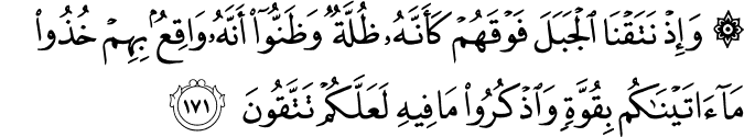 photoTransliteration: Waith nataqna aljabala fawqahum kaannahu thullatun wathannoo annahu waqiAAun bihim khuthoo ma ataynakum biquwwatin waothkuroo ma feehi laAAallakum tattaqoona