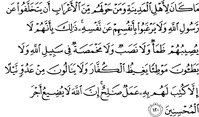 photoTransliteration: Ma kana liahli almadeenati waman hawlahum mina alaAArabi an yatakhallafoo AAan rasooli Allahi wala yarghaboo bianfusihim AAan nafsihi thalika biannahum la yuseebuhum thamaon wala nasabun wala makhmasatun fee sabeeli Allahi wala yataoona mawtian yagheethu alkuffara wala yanaloona min AAaduwwin naylan illa kutiba lahum bihi AAamalun salihun inna Allaha la yudeeAAu ajra almuhsineena