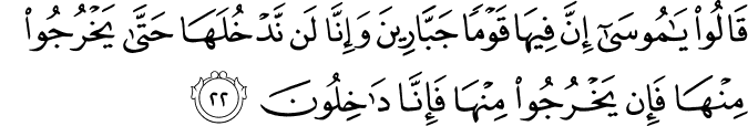 photoTransliteration: Qaloo ya moosa inna feeha qawman jabbareena wainna lan nadkhulaha hatta yakhrujoo minha fain yakhrujoo minha fainna dakhiloona