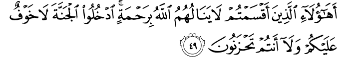 photoTransliteration: Ahaolai allatheena aqsamtum la yanaluhumu Allahu birahmatin odkhuloo aljannata la khawfun AAalaykum wala antum tahzanoona