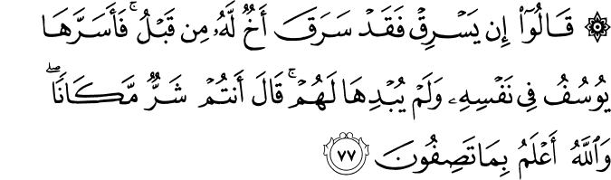 Translation: At this discovery the brothers remarked, "There is nothing strange in it that he has committed a theft, for his brother (Joseph) also committed a theft before this."61 Hearing this, Joseph suppressed his feelings and did not reveal the secret to them, but said only this in an under tone, "What a bad people you are! you are accusing me (to my face) of the thing the truth of which Allah knows best."