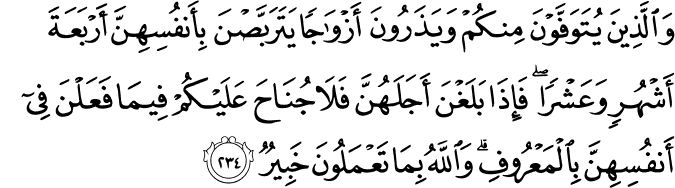 photoTransliteration: Waallatheena yutawaffawna minkum wayatharoona azwajan yatarabbasna bianfusihinna arbaAAata ashhurin waAAashran faitha balaghna ajalahunna fala junaha AAalaykum feema faAAalna fee anfusihinna bialmaAAroofi waAllahu bima taAAmaloona khabeerun