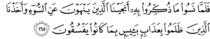Translation:However, when they totally forgot the teachings they were reminded of, We saved those who used to forbid evil, and seized with a severe scourge all others who were transgressors, because of the acts of disobedience they did.