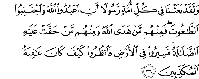 Translit: Walaqad baAAathna fee kulli ommatin rasoolan ani oAAbudoo Allaha waijtaniboo alttaghoota faminhum man hada Allahu waminhum man haqqat AAalayhi alddalalatu faseeroo fee alardi faonthuroo kayfa kana AAaqibatu almukaththibeena