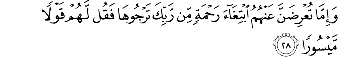 Translit: Waimma tuAAridanna AAanhumu ibtighaa rahmatin min rabbika tarjooha faqul lahum qawlan maysooran