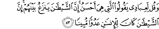Translit: Waqul liAAibadee yaqooloo allatee hiya ahsanu inna alshshaytana yanzaghu baynahum inna alshshaytana kana lilinsani AAaduwwan mubeenan
