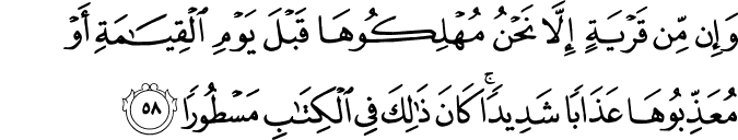 Translit: Wain min qaryatin illa nahnu muhlikooha qabla yawmi alqiyamati aw muAAaththibooha AAathaban shadeedan kana thalika fee alkitabi mastooran