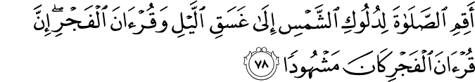 Translit: Aqimi alssalata lidulooki alshshamsi ila ghasaqi allayli waqurana alfajri inna qurana alfajri kana mashhoodan