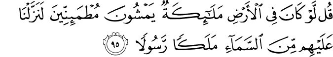 Translit: Qul law kana fee alardi malaikatun yamshoona mutmainneena lanazzalna AAalayhim mina alssamai malakan rasoolan