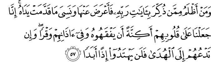 Translation:Now, who can be more unjust than the person before whom his Lord's Revelations are recited to admonish him, and he turns away from them and forgets the evil end to which he has paved the way with his own hands? As regards those people, who have adopted such an attitude, We have put coverings over their hearts which do not let them listen to the Qur'an, and We have produced heaviness in their ears. While in this state, they will never be guided aright howsoever you may invite them to the Guidance. |