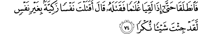 Translit: Faintalaqa hatta itha laqiya ghulaman faqatalahu qala aqatalta nafsan zakiyyatan bighayri nafsin laqad jita shayan nukran