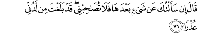 Translit: Qala in saaltuka AAan shayin baAAdaha fala tusahibnee qad balaghta min ladunnee AAuthran