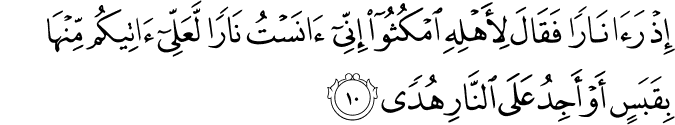 Translit: Ith raa naran faqala liahlihi omkuthoo innee anastu naran laAAallee ateekum minha biqabasin aw ajidu AAala alnnari hudan