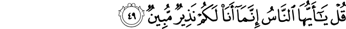 Translation:O, Muhammad, say to them: "O people, I am merely a warner who informs you plainly (of the coming evil time)."